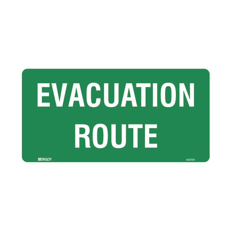 Features: Green background with white text: EVACUATION ROUTE